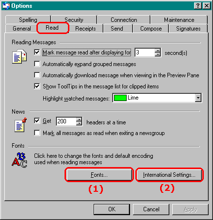 Zadnja stvar za koju se trebamo pobrinuti je da Outlook Express koristi ISO Encoding kod odgovora na poruke koje nisu ISO kodirane, umjesto da zadrži encoding originalne poruke. To uradimo pod International Settings... (2) u Read opcijama...