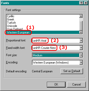 Najprije se pozabavimo porukama koje su deklarirane kao Western European (1) i izaberimo uniHR Arial (2) kao Proportional font te uniHR Courier New (3) kao Fixed-width font, a zatim...