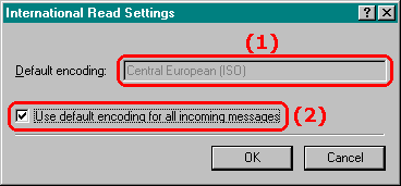Zadnja stvar za koju se trebamo pobrinuti je da Outlook Express koristi ISO Encoding kod odgovora na poruke koje nisu ISO kodirane, umjesto da zadrži encoding originalne poruke. To uradimo pod International Settings... (2) u Read opcijama...