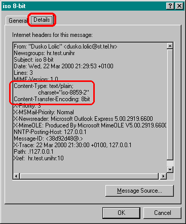 Ovim ste podesili Outlook Express za pravilno postanje novih poruka sa hrvatskim grafemima. Ako se želite uvjeriti da ste sve dobro napravili, pošaljite probnu poruku sa slovima ČĆŠŽĐ u hr.test grupu i pogledajte Properties te poruke (Alt+Enter). U headeru bi trebali vidjeti...