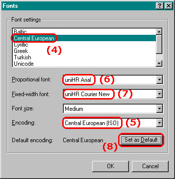 Ako ste do sada sve dobro napravili, Default encoding (1) bi trebao biti Central European (ISO). Ako nije, vratite se na Fonts dijalog i provjerite Encoding (5) i Default encoding (8).